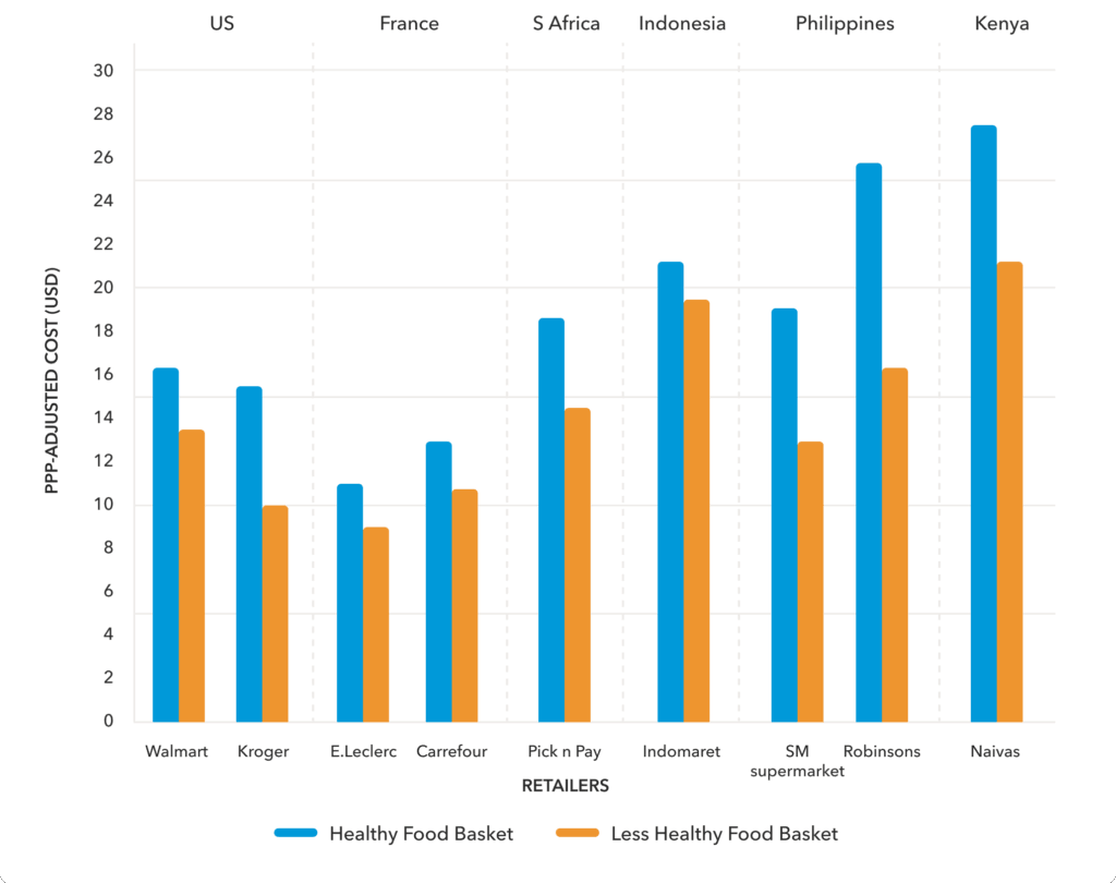 - Healthier food baskets cost 10% to 60% more than less healthy ones, across all countries and retailers.